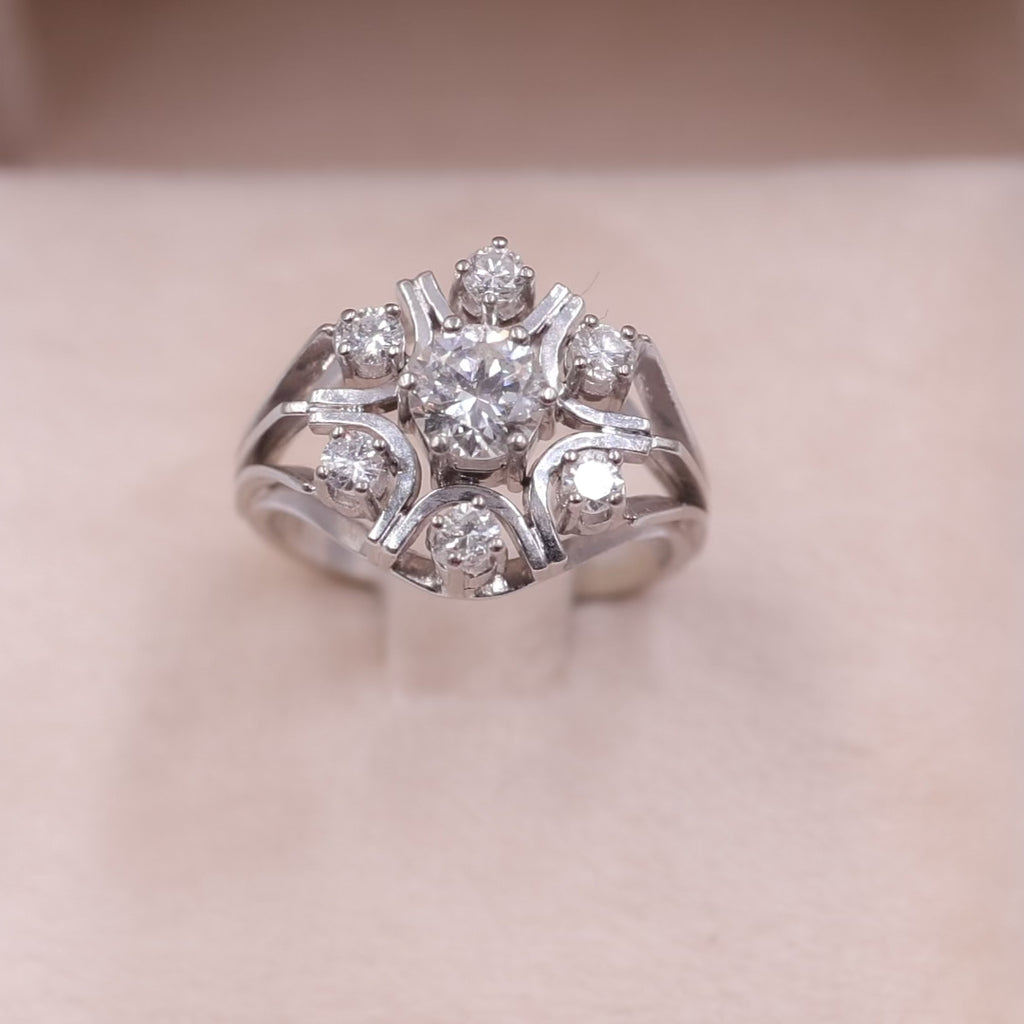 Bague fleur vintage en or blanc 14 carats avec diamant central de 0,80 ct et diamants environnants de 0,36 ct, années 70